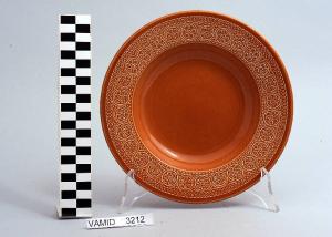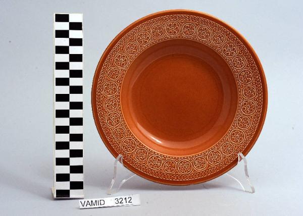 Piatto fondo circolare color terracotta; motivi decorativi geometrici e vegetali a rilievo lungo la tesa.