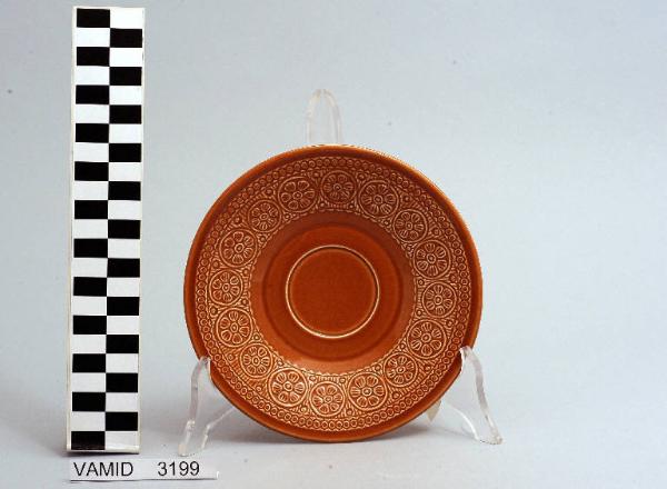 Piattino da thè circolare color terracotta; motivi decorativi geometrici e vegetali a rilievo lungo la tesa.