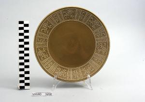 Piatto piano circolare color marrone; motivi decorativi geometrici e vegetali a rilievo lungo la tesa.