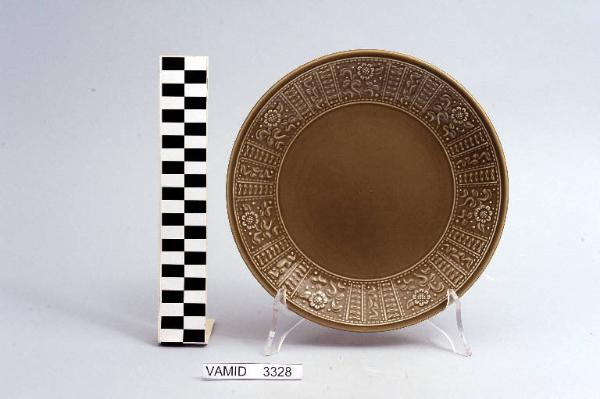Piatto piano circolare color marrone; motivi decorativi geometrici e vegetali a rilievo lungo la tesa.