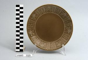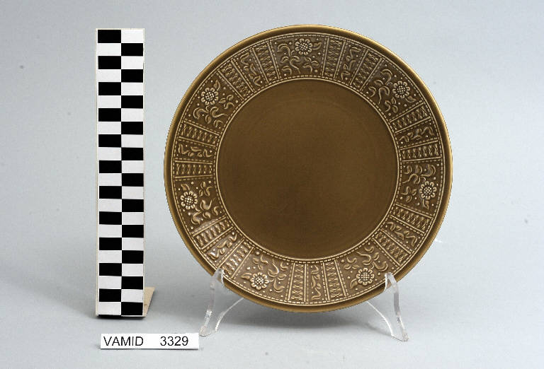 Piatto piano circolare color marrone; motivi decorativi geometrici e vegetali a rilievo lungo la tesa.