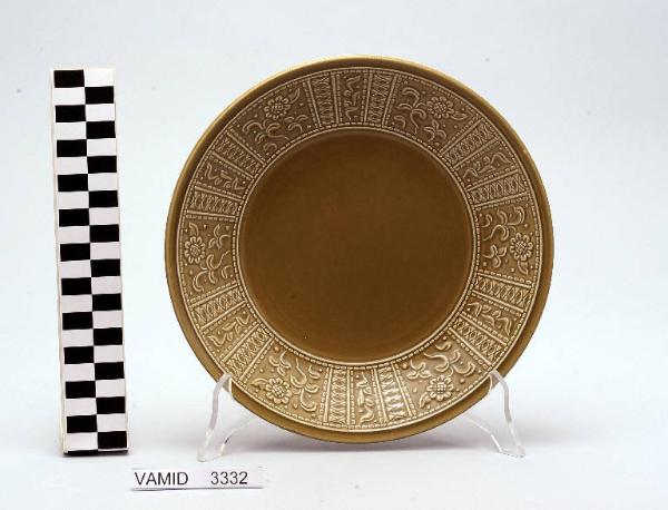 Piatto fondo circolare color marrone; motivi decorativi geometrici e vegetali a rilievo lungo la tesa.