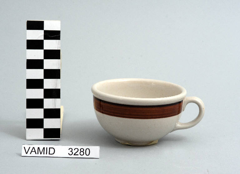 Tazza da thè di forma concava; manico a "C"; fondo bianco avorio decorato all'esterno con fascia marrone.
