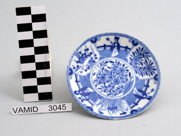 - NOTIZIE STORICO CRITICHE Il piattino, appartenente ad un servizio da caffè composto da dodici elementi (nn. inv. 3044-3055), è decorato sottosmalto in monocromo blu. Il marchio non identificato permette comunque di escludere una manifattura lavenese. L'influenza dell'arte giapponese in Occidente cominciò a farsi sentire nella seconda metà dell'Ottocento. Già per l'Esposizione Universale di Parigi del 1867 e poi per quella delle Belle - Arti applicate all'industria del 1874, vennero realizzati manufatti in ceramica con decori giapponesizzanti. Tale tipologia continuò ad essere riproposta fino ai primi decenni del Novecento. La foggia funzionale dell'oggetto e la tipologia del decoro privo di tridimensionalità indicano una datazione alla metà del Novecento. Il piattino fa parte di una donazione di privati al Museo.