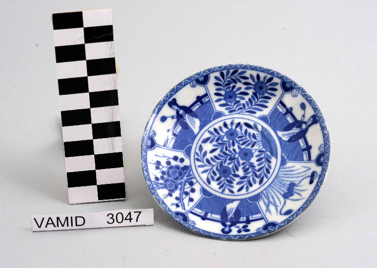 - NOTIZIE STORICO CRITICHE Il piattino, appartenente ad un servizio da caffè composto da dodici elementi (nn. inv. 3044-3055), è decorato sottosmalto in monocromo blu. Il marchio non identificato permette comunque di escludere una manifattura lavenese. L'influenza dell'arte giapponese in Occidente cominciò a farsi sentire nella seconda metà dell'Ottocento. Già per l'Esposizione Universale di Parigi del 1867 e poi per quella delle Belle - Arti applicate all'industria del 1874, vennero realizzati manufatti in ceramica con decori giapponesizzanti. Tale tipologia continuò ad essere riproposta fino ai primi decenni del Novecento. La foggia funzionale dell'oggetto e la tipologia del decoro privo di tridimensionalità indicano una datazione alla metà del Novecento. Il piattino fa parte di una donazione di privati al Museo.