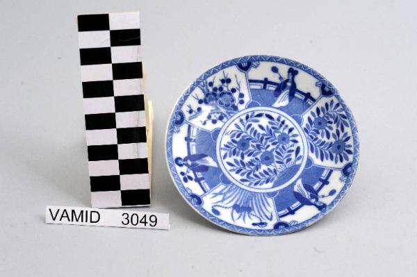 - NOTIZIE STORICO CRITICHE Il piattino, appartenente ad un servizio da caffè composto da dodici elementi (nn. inv. 3044-3055), è decorato sottosmalto in monocromo blu. Il marchio non identificato permette comunque di escludere una manifattura lavenese. L'influenza dell'arte giapponese in Occidente cominciò a farsi sentire nella seconda metà dell'Ottocento. Già per l'Esposizione Universale di Parigi del 1867 e poi per quella delle Belle - Arti applicate all'industria del 1874, vennero realizzati manufatti in ceramica con decori giapponesizzanti. Tale tipologia continuò ad essere riproposta fino ai primi decenni del Novecento. La foggia funzionale dell'oggetto e la tipologia del decoro privo di tridimensionalità indicano una datazione alla metà del Novecento. Il piattino fa parte di una donazione di privati al Museo.