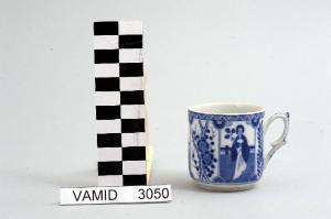 Tazzina da caffè con corpo cilindrico; manico a "C" con profilo esterno mistilineo schiacciato; fondo bianco avorio con scena orientale e motivi decorativi vegetali in monocromo blu all'esterno; bordo rifinito con greca geometrica blu; bianco internamente.