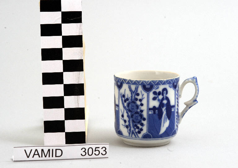 Tazzina da caffè con corpo cilindrico; manico a "C" con profilo esterno mistilineo schiacciato; fondo bianco avorio con scena orientale e motivi decorativi vegetali in monocromo blu all'esterno; bordo rifinito con greca geometrica blu; bianco internamente.