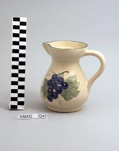 Brocca con corpo globulare; piede circolare; manico a "C" liscio; beccuccio sporgente; fondo bianco decorato con grappolo d'uva all'esterno; bordo rifinito in verde.
