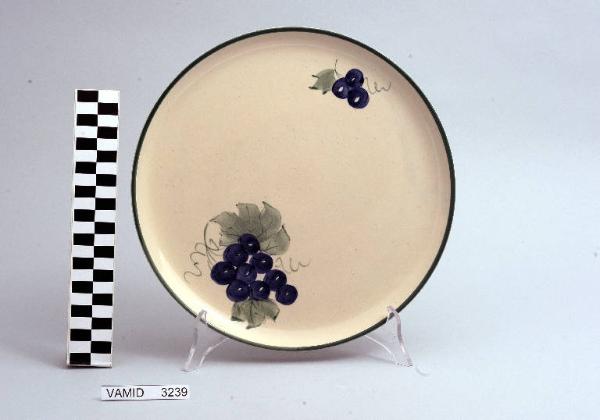 Piatto piano circolare bianco decorato con grappoli d'uva; bordo rifinito in verde.