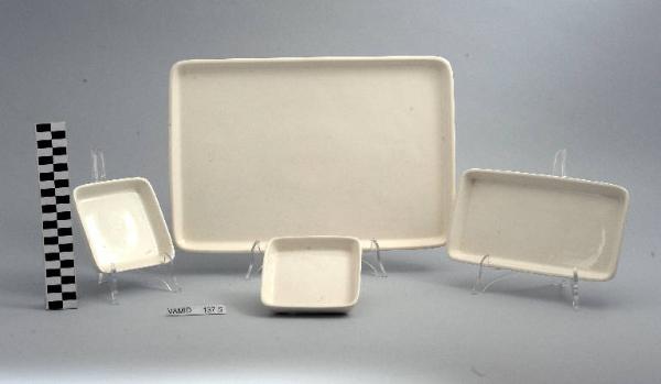 - NOTIZIE STORICO CRITICHE Il servizio in esame, composto da sei elementi (nn. inv. 3107-3110, 3152-3153), rientra in una tipologia di vasellame di gusto corrente. La foggia semplice ed essenziale indica una evidente assimilazione dei concetti legati al funzionalismo e quindi una datazione alla metà del Novecento. La mancanza di caratteri stilistici particolari impedisce una definizione cronologica più circoscritta. Fa parte di una donazione di privati al Museo. Nella fotografia mancano due ciotole.