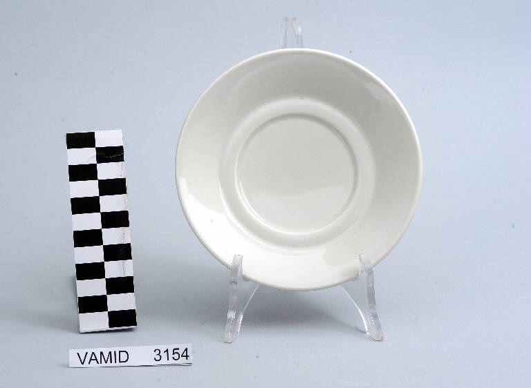 - NOTIZIE STORICO CRITICHE Il design essenziale e funzionale del piattino, appartenente ad un servizio da thè composto da quattro elementi (nn. inv. 3125...3154), indica una datazione ormai avanzata nel Novecento. Il marchio presente sul fondo, applicato sulle porcellane prodotte dalla Richard Ginori presso lo stabilimento di Chieti, è stato usato indicativamente dal 1966 al 1994. Il piattino fa parte di una donazione di privati al Museo.