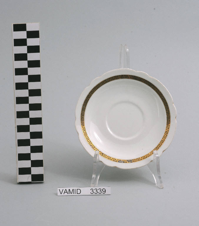 - NOTIZIE STORICO CRITICHE L'oggetto in esame, appartenente ad un servizio da thè composto da quattro elementi (3339-3341, 3699), rientra in una tipologia di vasellame di gusto popolare. Il design sobrio ed elegante e il bordo sottolineato da una filettatura oro denotano una ricerca stilistica riferibile alla metà del Novecento. Il decoro a carattere geometrico, denominato "7091", venne utilizzato anche dalla "S.C.I" come dimostra la piastrella realizzata come campionario conservata presso il Midec (num. inv. 2645). Il piattino fa parte di una donazione di privati al Museo.