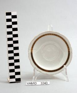 - NOTIZIE STORICO CRITICHE L'oggetto in esame, appartenente ad un servizio da thè composto da quattro elementi (3339-3341, 3699), rientra in una tipologia di vasellame di gusto popolare. Il design sobrio ed elegante e il bordo sottolineato da una filettatura oro denotano una ricerca stilistica riferibile alla metà del Novecento. Il decoro a carattere geometrico, denominato "7091", venne utilizzato anche dalla "S.C.I" come dimostra la piastrella realizzata come campionario conservata presso il Midec (num. inv. 2645). Il piattino fa parte di una donazione di privati al Museo.