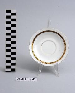 - NOTIZIE STORICO CRITICHE L'oggetto in esame, appartenente ad un servizio da thè composto da quattro elementi (3339-3341, 3699), rientra in una tipologia di vasellame di gusto popolare. Il design sobrio ed elegante e il bordo sottolineato da una filettatura oro denotano una ricerca stilistica riferibile alla metà del Novecento. Il decoro a carattere geometrico, denominato "7091", venne utilizzato anche dalla "S.C.I" come dimostra la piastrella realizzata come campionario conservata presso il Midec (num. inv. 2645). Il piattino fa parte di una donazione di privati al Museo.