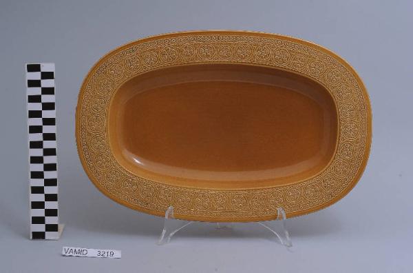 Antipastiera di forma rettangolare con angoli arrotondati; fondo color giallo aranciato; motivi decorativi geometrici e vegetali a rilievo lungo la tesa.