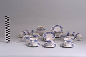 Servizio da caffè composto da sedici piattini, tredici tazzine e una zuccheriera; fondo bianco decorato da maglia romboidale ornata da piccoli fiori in monocromo color blu.