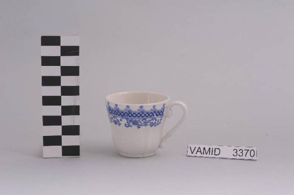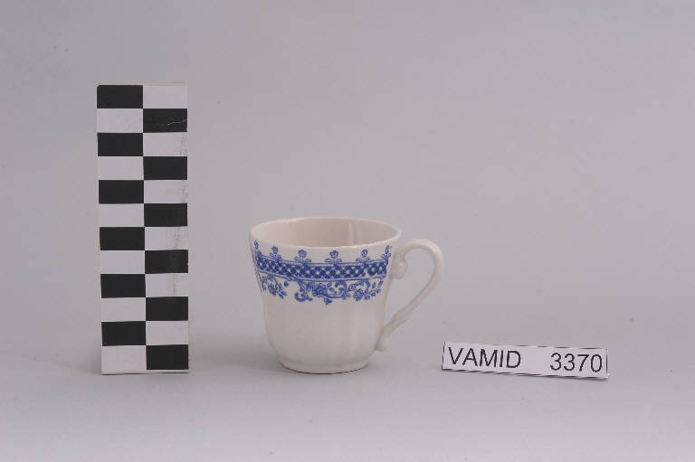 - NOTIZIE STORICO CRITICHE Il manufatto in esame, che fa parte di un servizio da caffè (num. inv. 3346-3375), si lega tipologicamente ad un piattino conservato presso il Museo (num. inv. 1435). La linea ancora classica e il decoro minuto e lezioso richiamano un gusto in voga tra Otto e Novecento. L'ornato costituito da elementi floreali e da una maglia romboidale è realizzato con la tecnica della decalcomania sottosmalto in monocromo color blu. La tazzina fa parte di una donazione di privati al Museo. Nel Midec è conservato anche un servizio da frutta con la medesima greca ornamentale in monocromo color verde (num. inv. 3406-3419).