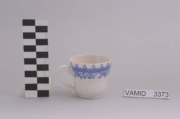 - NOTIZIE STORICO CRITICHE Il manufatto in esame, che fa parte di un servizio da caffè (num. inv. 3346-3375), si lega tipologicamente ad un piattino conservato presso il Museo (num. inv. 1435). La linea ancora classica e il decoro minuto e lezioso richiamano un gusto in voga tra Otto e Novecento. L'ornato costituito da elementi floreali e da una maglia romboidale è realizzato con la tecnica della decalcomania sottosmalto in monocromo color blu. La tazzina fa parte di una donazione di privati al Museo. Nel Midec è conservato anche un servizio da frutta con la medesima greca ornamentale in monocromo color verde (num. inv. 3406-3419).