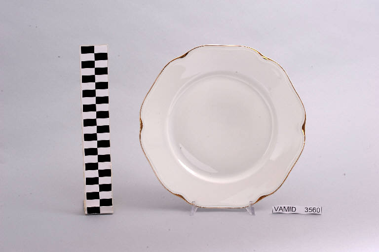 - NOTIZIE STORICO CRITICHE L'oggetto in esame, appartenente ad un servizio da tavola composto da cinquantaquattro elementi (num. inv. 3102...3565), rientra in una tipologia di vasellame di gusto popolare. Il design sobrio ed elegante, una linea ondulata e il bordo sottolineato da una filettatura oro denotano una ricerca stilistica riferibile alla metà del Novecento. La "Società Ceramica del Verbano" venne fondata nel 1924 per competere con la porcellana di Doccia. Malgrado la qualità materica e formale dei suoi servizi, la "Verbano", non ebbe mai sul mercato della porcellana la potenza e l'inventiva della Ginori. Il piatto fa parte di una donazione di privati al Museo.