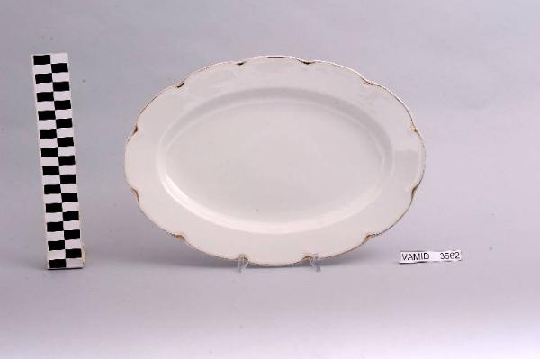 Piatto da portata ovale di colore bianco; bordo ondulato rifinito con filettatura oro.