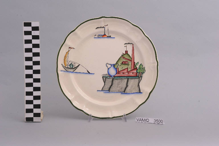 - NOTIZIE STORICO CRITICHE Il piatto, in serie con altri aventi decori diversi, fa parte di un servizio da tavola della forma "Vecchio Milano" con decoro "Lago Maggiore" n. 6641 (num. inv. 2051...3517). In questo esemplare è raffigurata, oltre ai soliti elementi caratteristici del lago, una veduta fortemente simbolica, attorno alla quale ruotano tutte le altre vedute presenti sul servizio: è la veduta dello stabilimento Verbano della "S.C.I." di Laveno, che fu inaugurato in quell'anno e che fu l'occasione per la realizzazione del servizio in oggetto. L'orgoglio per la produzione lavenese di vasellame e stoviglie, ricono"S.C.I."uta in quel momento tra le migliori d'Europa, è sottolineato anche dalla presenza di un vaso gigantesco adagiato sul prato antistante la fabbrica e di una zuppiera all'interno della barca da pesca sulla sinistra. In terraglia forte il servizio "Vecchio Milano" venne prodotto dalla "S.C.I." a partire dal 1923. Il fatto che il decoro "Lago Maggiore" non sia riportato sul catalogo del 1926 induce a pensare che sia stato creato dall'Andlovitz dopo questa data. La sua ideazione, pertanto, viene a collocarsi molto probabilmente tra il 1926 e il 1927, cioè tra il catalogo aziendale e la nascita della nuova forma per la III Biennale di Monza. Nel 1931 l'Andlovitz, che fin dalla sua nomina a direttore artistico si prefisse di rigenerare le forme tradizionali con decori nuovi, adattò alla forma "Vecchio Milano" il nuovissimo decoro "Lago Maggiore", a conferma che una decorazione nuova, se concepita organicamente, può conferire un aspetto attuale e "scattante" anche a una bella forma tradizionale. Nell'ambito dei repertori decorativi creati dall'Andlovitz il decoro "Lago Maggiore" rappresenta un modo frazionato di raffigurare il paesaggio, definito da Mario Munari a "scena spezzata". L'impianto decorativo di queste ceramiche rifugge dalla centralità e dalle strutturazioni lungo direttrici ortogonali, mentre vi predominano l'asimmetria e le fughe visuali sghembe che risentono del gusto per la cineseria e il giapponismo. La semplificazione geometrica degli elementi e il modo di sfumare i corpi nel'intento di suggerirne la volumetria ricorda le opere di Carlo Carrà degli anni venti. Nel decoro "Lago Maggiore" sono presenti espressioni diversificate di un tema molto caro a Guido Andlovitz: i "paesaggi d'acqua" con particolare ricorrenza delle 'barche' raffigurate in una vasta gamma di tipi, generalmente riprese da modelli reali e con divertenti variazioni fantastiche. Il decoro "Lago" fu applicato in un primo momento sulla forma "Vecchio Milano", poi sulla forma "Pomezia" (1936 ca.). Di tale decoro esistono diversi disegni originali a matita, pastello, inchiostro e acquerello su carta conservati nel fondo archivistico della "S.C.I.": alcuni di questi raffigurano il decoro proprio sulla forma "Vecchio Milano" con le rifiniture che compaiono sui pezzi finiti. Nel Museo sono conservati anche un servizio da tavola (num. inv. 2667...2911) e un servizio da caffè (num. inv. 2672...2900) forma "Vecchio Milano" con decoro "Lago Maggiore" con filettaura policroma. Negli anni '90 la Richard Ginori ha rimesso in produzione il servizio "Lago". \nIl servizio in esame è eseguito a colaggio, mentre i decori sono realizzati a decalcomania e dipinti a mano: si vedano a tal proposito le lastre in rame acciaiato conservate nel Midec e raffiguranti molti dei decori presenti nel servizio in combinazioni diversificate (nn. inv. 2480, 2483, 2484, 2485).\nIl piatto fa parte di una donazione di privati al Museo (Bellorini e Porta, 2003).