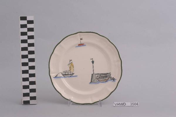- NOTIZIE STORICO CRITICHE Il piatto, in serie con altri aventi decori diversi, fa parte di un servizio da tavola della forma "Vecchio Milano" con decoro "Lago Maggiore" n. 6641 (num. inv. 2051...3517). Iin questo esemplare sono raffigurati elementi caratteristici della vita sul lago (un molo con faro e una barca tipica, detta burchiello, all'ancora, una boa con bandierina e un'altra barca da pesca in navigazione) rappresentati in un'atmosfera sospesa e silenziosa, seppur ridente nella resa stilizzata e nel fresco cromatismo delle raffigurazioni. In terraglia forte il servizio "Vecchio Milano" venne prodotto dalla "S.C.I." a partire dal 1923. Il fatto che il decoro "Lago Maggiore" non sia riportato sul catalogo del 1926 induce a pensare che sia stato creato dall'Andlovitz dopo questa data. La sua ideazione, pertanto, viene a collocarsi molto probabilmente tra il 1926 e il 1927, cioè tra il catalogo aziendale e la nascita della nuova forma per la III Biennale di Monza. Nel 1931 l'Andlovitz, che fin dalla sua nomina a direttore artistico si prefisse di rigenerare le forme tradizionali con decori nuovi, adattò alla forma "Vecchio Milano" il nuovissimo decoro "Lago Maggiore", a conferma che una decorazione nuova, se concepita organicamente, può conferire un aspetto attuale e "scattante" anche a una bella forma tradizionale. Nell'ambito dei repertori decorativi creati dall'Andlovitz il decoro "Lago Maggiore" rappresenta un modo frazionato di raffigurare il paesaggio, definito da Mario Munari a "scena spezzata". L'impianto decorativo di queste ceramiche rifugge dalla centralità e dalle strutturazioni lungo direttrici ortogonali, mentre vi predominano l'asimmetria e le fughe visuali sghembe che risentono del gusto per la cineseria e il giapponismo. La semplificazione geometrica degli elementi e il modo di sfumare i corpi nel'intento di suggerirne la volumetria ricorda le opere di Carlo Carrà degli anni venti. Nel decoro "Lago Maggiore" sono presenti espressioni diversificate di un tema molto caro a Guido Andlovitz: i "paesaggi d'acqua" con particolare ricorrenza delle 'barche' raffigurate in una vasta gamma di tipi, generalmente riprese da modelli reali e con divertenti variazioni fantastiche. Il decoro "Lago" fu applicato in un primo momento sulla forma "Vecchio Milano", poi sulla forma "Pomezia" (1936 ca.). Di tale decoro esistono diversi disegni originali a matita, pastello, inchiostro e acquerello su carta conservati nel fondo archivistico della "S.C.I.": alcuni di questi raffigurano il decoro proprio sulla forma "Vecchio Milano" con le rifiniture che compaiono sui pezzi finiti. Nel Museo sono conservati anche un servizio da tavola (num. inv. 2667...2911) e un servizio da caffè (num. inv. 2672...2900) forma "Vecchio Milano" con decoro "Lago Maggiore" con filettaura policroma. Negli anni '90 la Richard Ginori ha rimesso in produzione il servizio "Lago". \nIl servizio in esame è eseguito a colaggio, mentre i decori sono realizzati a decalcomania e dipinti a mano: si vedano a tal proposito le lastre in rame acciaiato conservate nel Midec e raffiguranti molti dei decori presenti nel servizio in combinazioni diversificate (nn. inv. 2480, 2483, 2484, 2485).\nIl piatto fa parte di una donazione di privati al Museo (Bellorini e Porta, 2003).