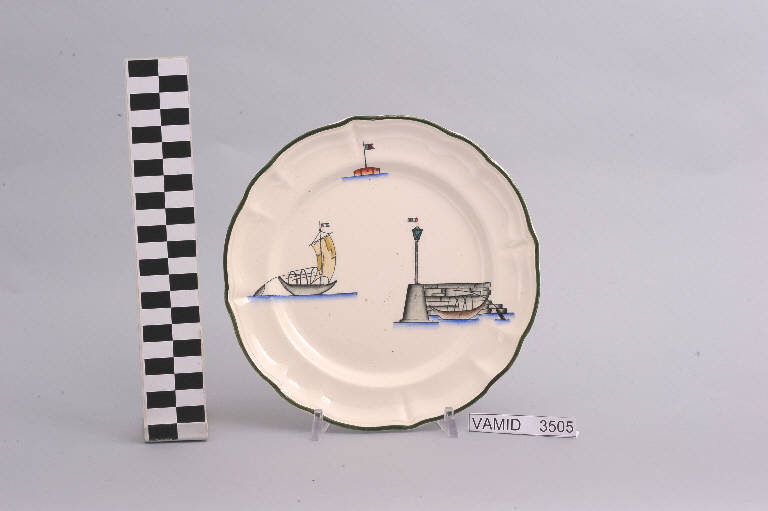 - NOTIZIE STORICO CRITICHE Il piatto, in serie con altri aventi decori diversi, fa parte di un servizio da tavola della forma "Vecchio Milano" con decoro "Lago Maggiore" n. 6641 (num. inv. 2051...3517). Iin questo esemplare sono raffigurati elementi caratteristici della vita sul lago (un molo con faro e una barca tipica, detta burchiello, all'ancora, una boa con bandierina e un'altra barca da pesca in navigazione) rappresentati in un'atmosfera sospesa e silenziosa, seppur ridente nella resa stilizzata e nel fresco cromatismo delle raffigurazioni. In terraglia forte il servizio "Vecchio Milano" venne prodotto dalla "S.C.I." a partire dal 1923. Il fatto che il decoro "Lago Maggiore" non sia riportato sul catalogo del 1926 induce a pensare che sia stato creato dall'Andlovitz dopo questa data. La sua ideazione, pertanto, viene a collocarsi molto probabilmente tra il 1926 e il 1927, cioè tra il catalogo aziendale e la nascita della nuova forma per la III Biennale di Monza. Nel 1931 l'Andlovitz, che fin dalla sua nomina a direttore artistico si prefisse di rigenerare le forme tradizionali con decori nuovi, adattò alla forma "Vecchio Milano" il nuovissimo decoro "Lago Maggiore", a conferma che una decorazione nuova, se concepita organicamente, può conferire un aspetto attuale e "scattante" anche a una bella forma tradizionale. Nell'ambito dei repertori decorativi creati dall'Andlovitz il decoro "Lago Maggiore" rappresenta un modo frazionato di raffigurare il paesaggio, definito da Mario Munari a "scena spezzata". L'impianto decorativo di queste ceramiche rifugge dalla centralità e dalle strutturazioni lungo direttrici ortogonali, mentre vi predominano l'asimmetria e le fughe visuali sghembe che risentono del gusto per la cineseria e il giapponismo. La semplificazione geometrica degli elementi e il modo di sfumare i corpi nel'intento di suggerirne la volumetria ricorda le opere di Carlo Carrà degli anni venti. Nel decoro "Lago Maggiore" sono presenti espressioni diversificate di un tema molto caro a Guido Andlovitz: i "paesaggi d'acqua" con particolare ricorrenza delle 'barche' raffigurate in una vasta gamma di tipi, generalmente riprese da modelli reali e con divertenti variazioni fantastiche. Il decoro "Lago" fu applicato in un primo momento sulla forma "Vecchio Milano", poi sulla forma "Pomezia" (1936 ca.). Di tale decoro esistono diversi disegni originali a matita, pastello, inchiostro e acquerello su carta conservati nel fondo archivistico della "S.C.I.": alcuni di questi raffigurano il decoro proprio sulla forma "Vecchio Milano" con le rifiniture che compaiono sui pezzi finiti. Nel Museo sono conservati anche un servizio da tavola (num. inv. 2667...2911) e un servizio da caffè (num. inv. 2672...2900) forma "Vecchio Milano" con decoro "Lago Maggiore" con filettaura policroma. Negli anni '90 la Richard Ginori ha rimesso in produzione il servizio "Lago". \nIl servizio in esame è eseguito a colaggio, mentre i decori sono realizzati a decalcomania e dipinti a mano: si vedano a tal proposito le lastre in rame acciaiato conservate nel Midec e raffiguranti molti dei decori presenti nel servizio in combinazioni diversificate (nn. inv. 2480, 2483, 2484, 2485).\nIl piatto fa parte di una donazione di privati al Museo (Bellorini e Porta, 2003).
