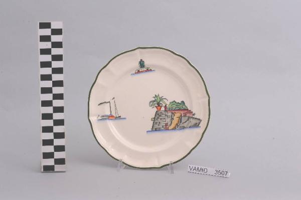 • NOTIZIE STORICO CRITICHE Il piatto, in serie con altri aventi decori diversi, fa parte di un servizio da tavola della forma "Vecchio Milano" con decoro "Lago Maggiore" n. 6641 (num. inv. 2051...3517). In questo esemplare sono raffigurati elementi caratteristici della vita sul lago (un attracco con scaletta e piante, un battello a vapore in navigazione e una boa luminosa) rappresentati in un'atmosfera sospesa e silenziosa, seppur ridente nella resa stilizzata e nel fresco cromatismo delle raffigurazioni. In terraglia forte il servizio "Vecchio Milano" venne prodotto dalla "S.C.I." a partire dal 1923. Il fatto che il decoro "Lago Maggiore" non sia riportato sul catalogo del 1926 induce a pensare che sia stato creato dall'Andlovitz dopo questa data. La sua ideazione, pertanto, viene a collocarsi molto probabilmente tra il 1926 e il 1927, cioè tra il catalogo aziendale e la nascita della nuova forma per la III Biennale di Monza. Nel 1931 l'Andlovitz, che fin dalla sua nomina a direttore artistico si prefisse di rigenerare le forme tradizionali con decori nuovi, adattò alla forma "Vecchio Milano" il nuovissimo decoro "Lago Maggiore", a conferma che una decorazione nuova, se concepita organicamente, può conferire un aspetto attuale e "scattante" anche a una bella forma tradizionale. Nell'ambito dei repertori decorativi creati dall'Andlovitz il decoro "Lago Maggiore" rappresenta un modo frazionato di raffigurare il paesaggio, definito da Mario Munari a "scena spezzata". L'impianto decorativo di queste ceramiche rifugge dalla centralità e dalle strutturazioni lungo direttrici ortogonali, mentre vi predominano l'asimmetria e le fughe visuali sghembe che risentono del gusto per la cineseria e il giapponismo. La semplificazione geometrica degli elementi e il modo di sfumare i corpi nel'intento di suggerirne la volumetria ricorda le opere di Carlo Carrà degli anni venti. Nel decoro "Lago Maggiore" sono presenti espressioni diversificate di un tema molto caro a Guido Andlovitz: i "paesaggi d'acqua" con particolare ricorrenza delle 'barche' raffigurate in una vasta gamma di tipi, generalmente riprese da modelli reali e con divertenti variazioni fantastiche. Il decoro "Lago" fu applicato in un primo momento sulla forma "Vecchio Milano", poi sulla forma "Pomezia" (1936 ca.). Di tale decoro esistono diversi disegni originali a matita, pastello, inchiostro e acquerello su carta conservati nel fondo archivistico della "S.C.I.": alcuni di questi raffigurano il decoro proprio sulla forma "Vecchio Milano" con le rifiniture che compaiono sui pezzi finiti. Nel Museo sono conservati anche un servizio da tavola (num. inv. 2667...2911) e un servizio da caffè (num. inv. 2672...2900) forma "Vecchio Milano" con decoro "Lago Maggiore" con filettaura policroma. Negli anni '90 la Richard Ginori ha rimesso in produzione il servizio "Lago". \nIl servizio in esame è eseguito a colaggio, mentre i decori sono realizzati a decalcomania e dipinti a mano: si vedano a tal proposito le lastre in rame acciaiato conservate nel Midec e raffiguranti molti dei decori presenti nel servizio in combinazioni diversificate (nn. inv. 2480, 2483, 2484, 2485).\nIl piatto fa parte di una donazione di privati al Museo (Bellorini e Porta, 2003).