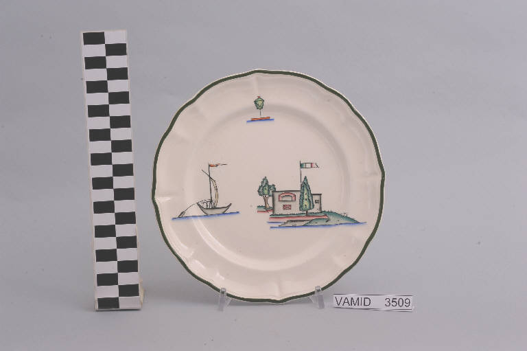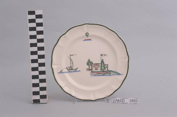 - NOTIZIE STORICO CRITICHE Il piatto, in serie con altri aventi decori diversi, fa parte di un servizio da tavola della forma "Vecchio Milano" con decoro "Lago Maggiore" n. 6641 (num. inv. 2051...3517). In questo esemplare sono raffigurati uno scorcio (un fortino con bandiera italiana sulla riva del lago) ed elementi caratteristici della vita sul lago (una boa luminosa e una barca da pesca tipica, detta burchiello, in navigazione) rappresentati in un'atmosfera sospesa e silenziosa, seppur ridente nella resa stilizzata e nel fresco cromatismo delle raffigurazioni. In terraglia forte il servizio "Vecchio Milano" venne prodotto dalla "S.C.I." a partire dal 1923. Il fatto che il decoro "Lago Maggiore" non sia riportato sul catalogo del 1926 induce a pensare che sia stato creato dall'Andlovitz dopo questa data. La sua ideazione, pertanto, viene a collocarsi molto probabilmente tra il 1926 e il 1927, cioè tra il catalogo aziendale e la nascita della nuova forma per la III Biennale di Monza. Nel 1931 l'Andlovitz, che fin dalla sua nomina a direttore artistico si prefisse di rigenerare le forme tradizionali con decori nuovi, adattò alla forma "Vecchio Milano" il nuovissimo decoro "Lago Maggiore", a conferma che una decorazione nuova, se concepita organicamente, può conferire un aspetto attuale e "scattante" anche a una bella forma tradizionale. Nell'ambito dei repertori decorativi creati dall'Andlovitz il decoro "Lago Maggiore" rappresenta un modo frazionato di raffigurare il paesaggio, definito da Mario Munari a "scena spezzata". L'impianto decorativo di queste ceramiche rifugge dalla centralità e dalle strutturazioni lungo direttrici ortogonali, mentre vi predominano l'asimmetria e le fughe visuali sghembe che risentono del gusto per la cineseria e il giapponismo. La semplificazione geometrica degli elementi e il modo di sfumare i corpi nel'intento di suggerirne la volumetria ricorda le opere di Carlo Carrà degli anni venti. Nel decoro "Lago Maggiore" sono presenti espressioni diversificate di un tema molto caro a Guido Andlovitz: i "paesaggi d'acqua" con particolare ricorrenza delle 'barche' raffigurate in una vasta gamma di tipi, generalmente riprese da modelli reali e con divertenti variazioni fantastiche. Il decoro "Lago" fu applicato in un primo momento sulla forma "Vecchio Milano", poi sulla forma "Pomezia" (1936 ca.). Di tale decoro esistono diversi disegni originali a matita, pastello, inchiostro e acquerello su carta conservati nel fondo archivistico della "S.C.I.": alcuni di questi raffigurano il decoro proprio sulla forma "Vecchio Milano" con le rifiniture che compaiono sui pezzi finiti. Nel Museo sono conservati anche un servizio da tavola (num. inv. 2667...2911) e un servizio da caffè (num. inv. 2672...2900) forma "Vecchio Milano" con decoro "Lago Maggiore" con filettaura policroma. Negli anni '90 la Richard Ginori ha rimesso in produzione il servizio "Lago". \nIl servizio in esame è eseguito a colaggio, mentre i decori sono realizzati a decalcomania e dipinti a mano: si vedano a tal proposito le lastre in rame acciaiato conservate nel Midec e raffiguranti molti dei decori presenti nel servizio in combinazioni diversificate (nn. inv. 2480, 2483, 2484, 2485).\nIl piatto fa parte di una donazione di privati al Museo (Bellorini e Porta, 2003).