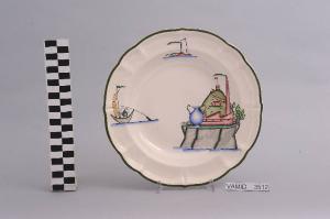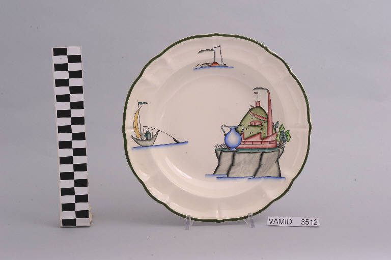 - NOTIZIE STORICO CRITICHE Il piatto, in serie con altri aventi decori diversi, fa parte di un servizio da tavola della forma "Vecchio Milano" con decoro "Lago Maggiore" n. 6641 (num. inv. 2051...3517). In questo esemplare è raffigurata, oltre ai soliti elementi caratteristici del lago, una veduta fortemente simbolica, attorno alla quale ruotano tutte le altre vedute presenti sul servizio: è la veduta dello stabilimento Verbano della "S.C.I". di Laveno, che fu inaugurato in quell'anno e che fu l'occasione per la realizzazione del servizio in oggetto. L'orgoglio per la produzione lavenese di vasellame e stoviglie, ricono"S.C.I."uta in quel momento tra le migliori d'Europa, è sottolineato anche dalla presenza di un vaso gigantesco adagiato sul prato antistante la fabbrica e di una zuppiera all'interno della barca da pesca sulla sinistra. In terraglia forte il servizio "Vecchio Milano" venne prodotto dalla "S.C.I." a partire dal 1923. Il fatto che il decoro "Lago Maggiore" non sia riportato sul catalogo del 1926 induce a pensare che sia stato creato dall'Andlovitz dopo questa data. La sua ideazione, pertanto, viene a collocarsi molto probabilmente tra il 1926 e il 1927, cioè tra il catalogo aziendale e la nascita della nuova forma per la III Biennale di Monza. Nel 1931 l'Andlovitz, che fin dalla sua nomina a direttore artistico si prefisse di rigenerare le forme tradizionali con decori nuovi, adattò alla forma "Vecchio Milano" il nuovissimo decoro "Lago Maggiore", a conferma che una decorazione nuova, se concepita organicamente, può conferire un aspetto attuale e "scattante" anche a una bella forma tradizionale. Nell'ambito dei repertori decorativi creati dall'Andlovitz il decoro "Lago Maggiore" rappresenta un modo frazionato di raffigurare il paesaggio, definito da Mario Munari a "scena spezzata". L'impianto decorativo di queste ceramiche rifugge dalla centralità e dalle strutturazioni lungo direttrici ortogonali, mentre vi predominano l'asimmetria e le fughe visuali sghembe che risentono del gusto per la cineseria e il giapponismo. La semplificazione geometrica degli elementi e il modo di sfumare i corpi nel'intento di suggerirne la volumetria ricorda le opere di Carlo Carrà degli anni venti. Nel decoro "Lago Maggiore" sono presenti espressioni diversificate di un tema molto caro a Guido Andlovitz: i "paesaggi d'acqua" con particolare ricorrenza delle 'barche' raffigurate in una vasta gamma di tipi, generalmente riprese da modelli reali e con divertenti variazioni fantastiche. Il decoro "Lago" fu applicato in un primo momento sulla forma "Vecchio Milano", poi sulla forma "Pomezia" (1936 ca.). Di tale decoro esistono diversi disegni originali a matita, pastello, inchiostro e acquerello su carta conservati nel fondo archivistico della "S.C.I.": alcuni di questi raffigurano il decoro proprio sulla forma "Vecchio Milano" con le rifiniture che compaiono sui pezzi finiti. Nel Museo sono conservati anche un servizio da tavola (num. inv. 2667...2911) e un servizio da caffè (num. inv. 2672...2900) forma "Vecchio Milano" con decoro "Lago Maggiore" con filettaura policroma. Negli anni '90 la Richard Ginori ha rimesso in produzione il servizio "Lago". \nIl servizio in esame è eseguito a colaggio, mentre i decori sono realizzati a decalcomania e dipinti a mano: si vedano a tal proposito le lastre in rame acciaiato conservate nel Midec e raffiguranti molti dei decori presenti nel servizio in combinazioni diversificate (nn. inv. 2480, 2483, 2484, 2485).\nIl piatto fa parte di una donazione di privati al Museo (Bellorini e Porta, 2003).