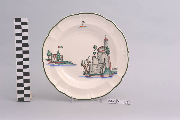- NOTIZIE STORICO CRITICHE Il piatto, in serie con altri aventi decori diversi, fa parte di un servizio da tavola della forma "Vecchio Milano" con decoro "Lago Maggiore" n. 6641 (num. inv. 2051...3517). In questo esemplare sono raffigurati la veduta di una chiesa con campanile e accesso al lago mediante una scalinata e alcuni elementi caratteristici della vita sul lago (un fortino con bandiera italiana sulla riva, e una boa con bandierina), rappresentati in un'atmosfera sospesa e silenziosa, seppur ridente nella resa stilizzata e nel fresco cromatismo delle raffigurazioni. In terraglia forte il servizio "Vecchio Milano" venne prodotto dalla "S.C.I." a partire dal 1923. Il fatto che il decoro "Lago Maggiore" non sia riportato sul catalogo del 1926 induce a pensare che sia stato creato dall'Andlovitz dopo questa data. La sua ideazione, pertanto, viene a collocarsi molto probabilmente tra il 1926 e il 1927, cioè tra il catalogo aziendale e la nascita della nuova forma per la III Biennale di Monza. Nel 1931 l'Andlovitz, che fin dalla sua nomina a direttore artistico si prefisse di rigenerare le forme tradizionali con decori nuovi, adattò alla forma "Vecchio Milano" il nuovissimo decoro "Lago Maggiore", a conferma che una decorazione nuova, se concepita organicamente, può conferire un aspetto attuale e "scattante" anche a una bella forma tradizionale. Nell'ambito dei repertori decorativi creati dall'Andlovitz il decoro "Lago Maggiore" rappresenta un modo frazionato di raffigurare il paesaggio, definito da Mario Munari a "scena spezzata". L'impianto decorativo di queste ceramiche rifugge dalla centralità e dalle strutturazioni lungo direttrici ortogonali, mentre vi predominano l'asimmetria e le fughe visuali sghembe che risentono del gusto per la cineseria e il giapponismo. La semplificazione geometrica degli elementi e il modo di sfumare i corpi nel'intento di suggerirne la volumetria ricorda le opere di Carlo Carrà degli anni venti. Nel decoro "Lago Maggiore" sono presenti espressioni diversificate di un tema molto caro a Guido Andlovitz: i "paesaggi d'acqua" con particolare ricorrenza delle 'barche' raffigurate in una vasta gamma di tipi, generalmente riprese da modelli reali e con divertenti variazioni fantastiche. Il decoro "Lago" fu applicato in un primo momento sulla forma "Vecchio Milano", poi sulla forma "Pomezia" (1936 ca.). Di tale decoro esistono diversi disegni originali a matita, pastello, inchiostro e acquerello su carta conservati nel fondo archivistico della "S.C.I.": alcuni di questi raffigurano il decoro proprio sulla forma "Vecchio Milano" con le rifiniture che compaiono sui pezzi finiti. Nel Museo sono conservati anche un servizio da tavola (num. inv. 2667...2911) e un servizio da caffè (num. inv. 2672...2900) forma "Vecchio Milano" con decoro "Lago Maggiore" con filettaura policroma. Negli anni '90 la Richard Ginori ha rimesso in produzione il servizio "Lago". \nIl servizio in esame è eseguito a colaggio, mentre i decori sono realizzati a decalcomania e dipinti a mano: si vedano a tal proposito le lastre in rame acciaiato conservate nel Midec e raffiguranti molti dei decori presenti nel servizio in combinazioni diversificate (nn. inv. 2480, 2483, 2484, 2485).\nIl piatto fa parte di una donazione di privati al Museo (Bellorini e Porta, 2003).