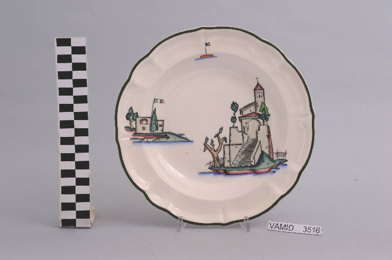 - NOTIZIE STORICO CRITICHE Il piatto, in serie con altri aventi decori diversi, fa parte di un servizio da tavola della forma "Vecchio Milano" con decoro "Lago Maggiore" n. 6641 (num. inv. 2051...3517). In questo esemplare sono raffigurati la veduta di una chiesa con campanile e accesso al lago mediante una scalinata e alcuni elementi caratteristici della vita sul lago (un fortino con bandiera italiana sulla riva, e una boa con bandierina), rappresentati in un'atmosfera sospesa e silenziosa, seppur ridente nella resa stilizzata e nel fresco cromatismo delle raffigurazioni. In terraglia forte il servizio "Vecchio Milano" venne prodotto dalla "S.C.I." a partire dal 1923. Il fatto che il decoro "Lago Maggiore" non sia riportato sul catalogo del 1926 induce a pensare che sia stato creato dall'Andlovitz dopo questa data. La sua ideazione, pertanto, viene a collocarsi molto probabilmente tra il 1926 e il 1927, cioè tra il catalogo aziendale e la nascita della nuova forma per la III Biennale di Monza. Nel 1931 l'Andlovitz, che fin dalla sua nomina a direttore artistico si prefisse di rigenerare le forme tradizionali con decori nuovi, adattò alla forma "Vecchio Milano" il nuovissimo decoro "Lago Maggiore", a conferma che una decorazione nuova, se concepita organicamente, può conferire un aspetto attuale e "scattante" anche a una bella forma tradizionale. Nell'ambito dei repertori decorativi creati dall'Andlovitz il decoro "Lago Maggiore" rappresenta un modo frazionato di raffigurare il paesaggio, definito da Mario Munari a "scena spezzata". L'impianto decorativo di queste ceramiche rifugge dalla centralità e dalle strutturazioni lungo direttrici ortogonali, mentre vi predominano l'asimmetria e le fughe visuali sghembe che risentono del gusto per la cineseria e il giapponismo. La semplificazione geometrica degli elementi e il modo di sfumare i corpi nel'intento di suggerirne la volumetria ricorda le opere di Carlo Carrà degli anni venti. Nel decoro "Lago Maggiore" sono presenti espressioni diversificate di un tema molto caro a Guido Andlovitz: i "paesaggi d'acqua" con particolare ricorrenza delle 'barche' raffigurate in una vasta gamma di tipi, generalmente riprese da modelli reali e con divertenti variazioni fantastiche. Il decoro "Lago" fu applicato in un primo momento sulla forma "Vecchio Milano", poi sulla forma "Pomezia" (1936 ca.). Di tale decoro esistono diversi disegni originali a matita, pastello, inchiostro e acquerello su carta conservati nel fondo archivistico della "S.C.I.": alcuni di questi raffigurano il decoro proprio sulla forma "Vecchio Milano" con le rifiniture che compaiono sui pezzi finiti. Nel Museo sono conservati anche un servizio da tavola (num. inv. 2667...2911) e un servizio da caffè (num. inv. 2672...2900) forma "Vecchio Milano" con decoro "Lago Maggiore" con filettaura policroma. Negli anni '90 la Richard Ginori ha rimesso in produzione il servizio "Lago". \nIl servizio in esame è eseguito a colaggio, mentre i decori sono realizzati a decalcomania e dipinti a mano: si vedano a tal proposito le lastre in rame acciaiato conservate nel Midec e raffiguranti molti dei decori presenti nel servizio in combinazioni diversificate (nn. inv. 2480, 2483, 2484, 2485).\nIl piatto fa parte di una donazione di privati al Museo (Bellorini e Porta, 2003).