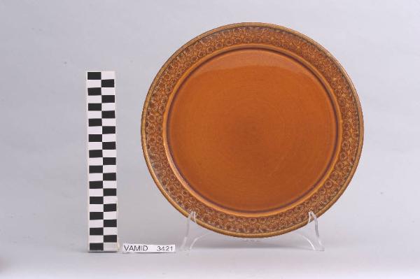 Piatto da portata circolare con bordo rialzato; fondo color terracotta con greca geometrica lungo la tesa.