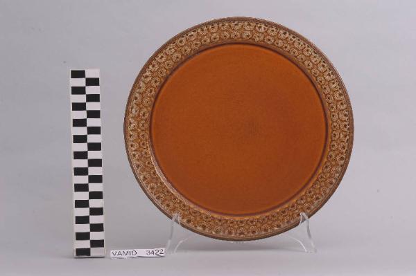Piatto da portata circolare con bordo rialzato; fondo color terracotta con greca geometrica lungo la tesa.