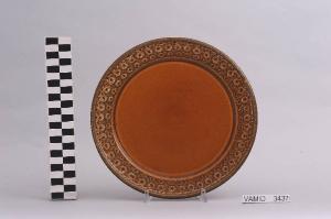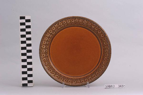 Piatto piano circolare con bordo rialzato; fondo color terracotta con greca geometrica lungo la tesa.