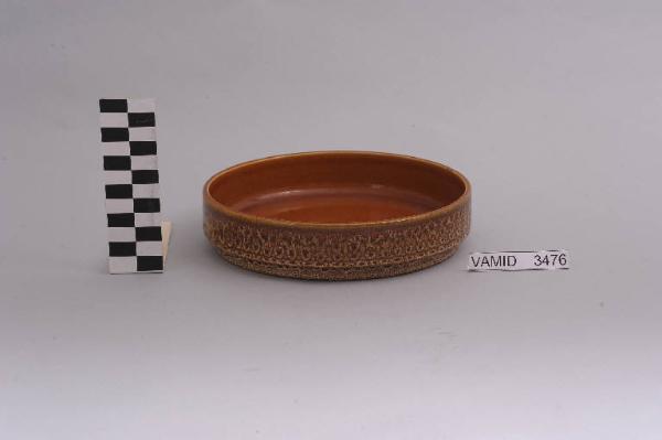 Piatto fondo circolare con alto bordo esterno decorato con greca geometrica; fondo color terracotta.