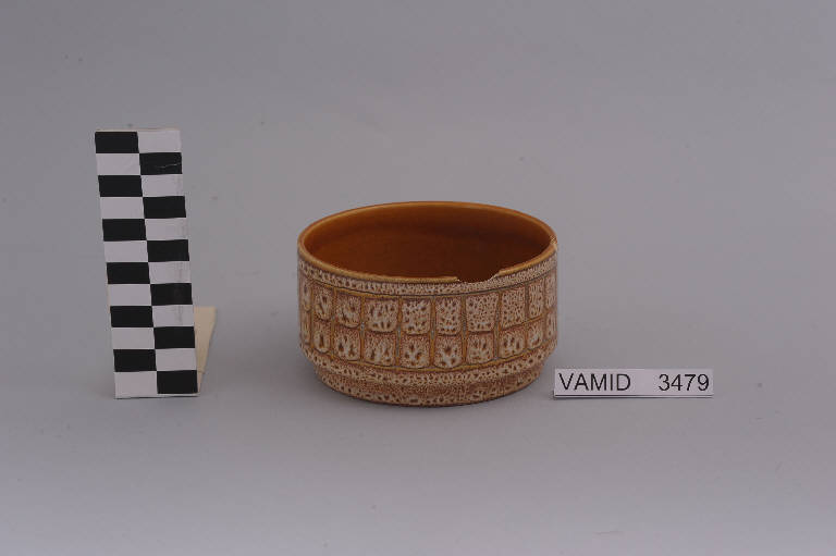 Coppetta circolare color terracotta con alto bordo esterno decorato da greca geometrica (presente anche sul fondo).