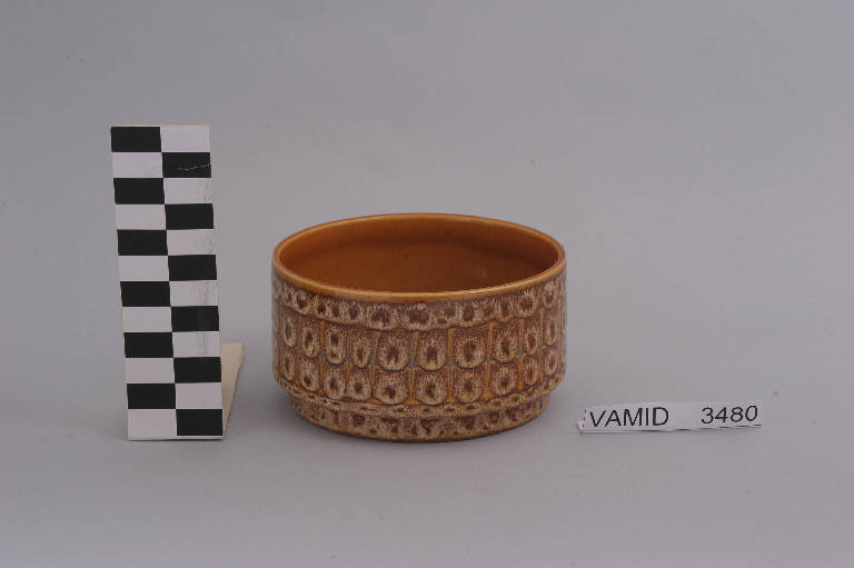 - NOTIZIE STORICO CRITICHE La coppetta in esame appartiene a un servizio da tavola di sessantasette elementi (num. inv. 3420-3486), riferibile ad una produzione di vasellame di gusto vivace e colorato. Il design essenziale e funzionale richiama il servizio impilabile denominato "Colonna" di Giovanni Gariboldi per Richard-Ginori, che vinse il Compasso d'Oro nel 1954 e che fu prodotto fino al 1967. Per questo riferimento e per la tipologia del decoro "a occhi" o a "piume di pavone" il servizio in oggetto può essere collocato negli anni '60. Il marchio presente sul fondo consente di attribuire il servizio alla Società Ceramica Revelli che chiuse definitivamente i battenti nel 1980. La coppetta fa parte di una donazione di privati al Museo (Lavezzari Fabio, 2009).