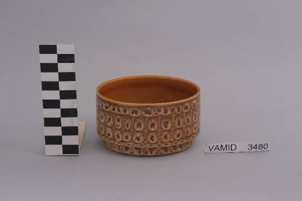 Coppetta circolare con alto bordo esterno decorato da greca geometrica; fondo color terracotta.