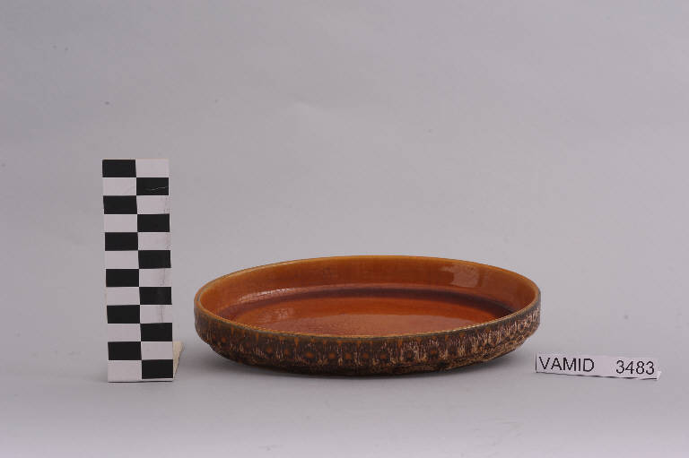 Antipastiera con alto bordo esterno decorato da greca geometrica; fondo color terracotta.