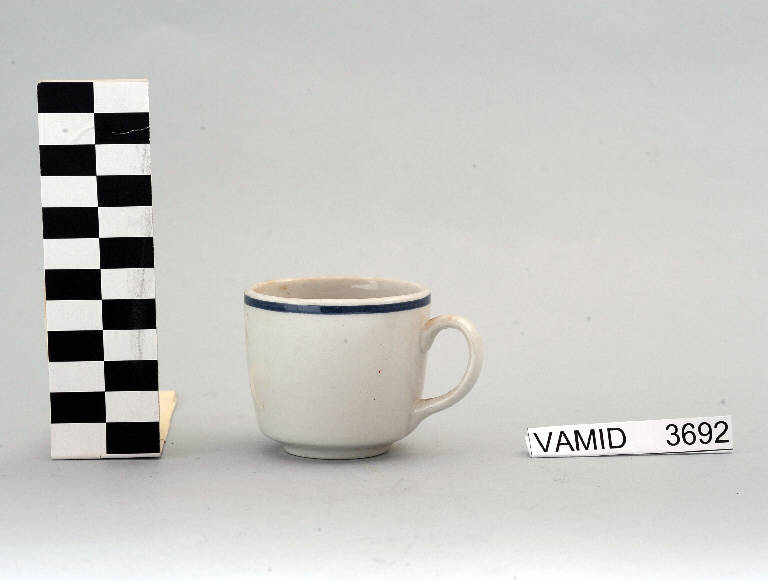 - NOTIZIE STORICO CRITICHE La foggia del manufatto in esame e la tipologia del decoro dei due piattini che completano il servizio (nn. inv. 3688, 3689) indicano una piena assimilazione della lezione del funzionalismo e quindi una datazione ormai oltre la metà del Novecento confermata anche dal marchio presente sul fondo usato dalla Richard Ginori dal 1950 al 1990 circa su tutti gli oggetti prodotti nello stabilimento di Lambrate. La tazzina, appartenente ad un servizio da caffè (num. inv. 3688-3695), fa parte di una donazione di privati al Museo.