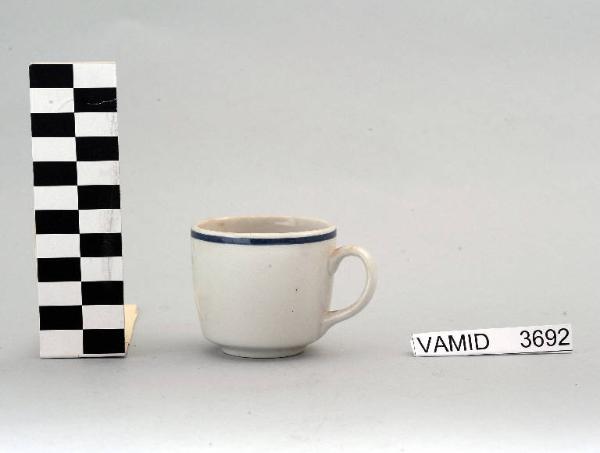 Tazzina da caffè con corpo cilindrico; fondo bianco con bordo superiore profilato di blu.