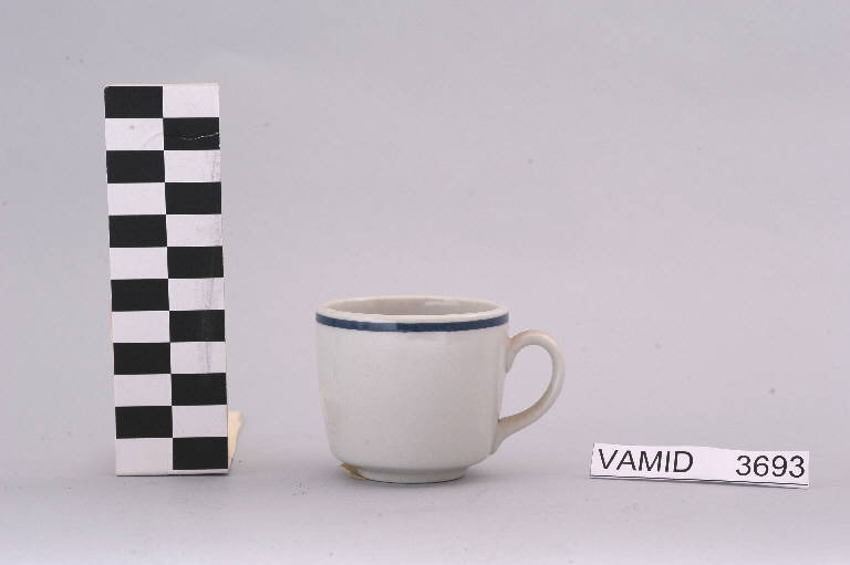 Tazzina da caffè con corpo cilindrico; fondo bianco con bordo superiore profilato di blu.