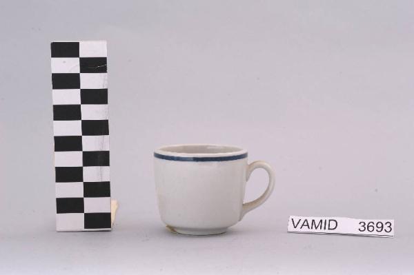 - NOTIZIE STORICO CRITICHE La foggia del manufatto in esame e la tipologia del decoro dei due piattini che completano il servizio (nn. inv. 3688, 3689) indicano una piena assimilazione della lezione del funzionalismo e quindi una datazione ormai oltre la metà del Novecento confermata anche dal marchio presente sul fondo usato dalla Richard Ginori dal 1950 al 1990 circa su tutti gli oggetti prodotti nello stabilimento di Lambrate. La tazzina, appartenente ad un servizio da caffè (num. inv. 3688-3695), fa parte di una donazione di privati al Museo.