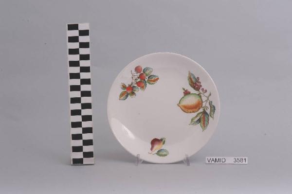 Piatto da frutta circolare di colore bianco con natura morta policroma in posizione decentrata.
