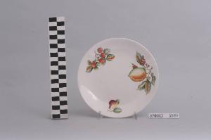 - NOTIZIE STORICO CRITICHE Il piatto da frutta in esame fa parte di un servizio da tavola composto da ventidue elementi. La foggia del servizio e la tipologia del decoro indicano una datazione ben oltre la metà del Novecento confermata anche dal marchio presente sul fondo usato dalla Richard Ginori nello stabilimento di Laveno Ponte dal 1966 al 1975 circa. Il motivo ornamentale, eseguito soprasmalto, è costituto da un ramo di fragole, una pera e un ramo di limone fiorito. Il piatto fa parte di una donazione di privati al Museo.