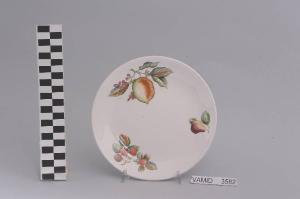 - NOTIZIE STORICO CRITICHE Il piatto da frutta in esame fa parte di un servizio da tavola composto da ventidue elementi. La foggia del servizio e la tipologia del decoro indicano una datazione ben oltre la metà del Novecento confermata anche dal marchio presente sul fondo usato dalla Richard Ginori nello stabilimento di Laveno Ponte dal 1966 al 1975 circa. Il motivo ornamentale è eseguito soprasmalto. Il motivo ornamentale, eseguito soprasmalto, è costituto da un ramo di fragole, una pera e un ramo di limone fiorito. Il piatto fa parte di una donazione di privati al Museo.