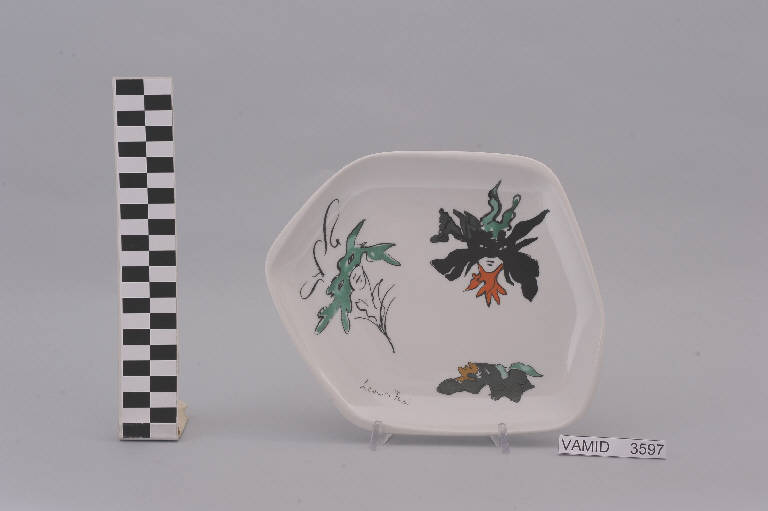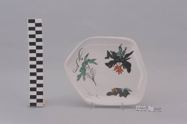 - NOTIZIE STORICO CRITICHE Il piatto piano in esame appartiene ad un servizio di piatti (num. inv. 3595-3601). Il motivo decorativo, costituito da maschere carnevalesche, è stato dipinto a mano soprasmalto da Leonor Fini, pittrice di fama internazionale, probabilmente dopo il 1951. In quell'anno, difatti, l'artista, dopo una mostra personale tenutasi al Museo Correr di Venezia, venne invitata a disegnare forme e decori di alcune ceramiche realizzate dalla "S.C.I." e dalla "Società Ceramica del Verbano". Il piatto fa parte di una donazione di privati al Museo. Tipologicamente si lega a due posaceneri, realizzati per la ICAT di Torino, conservati presso il Midec (nn. inv. 1666, 1667).