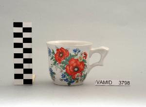 Tazza da thè a sezione poligonale con restringimento in prossimità del piede e bordo superiore leggermente estroflesso; manico mistilineo; fondo bianco con decoro floreale policromo disposto regolarmente all'esterno.